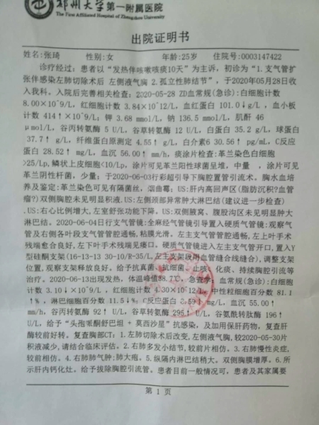 When Zhang Qi was discharged from the hospital, the medical records stated that a fungal infection was detected in her lungs during an examination on May 28, 2020. (Provided by Du Tingxiang and Zhang Qi)