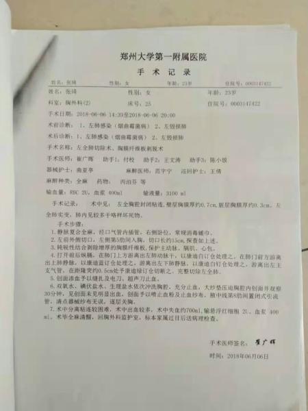 Photo shows medical records of Zhang Qi's surgery on June 6, 2018, at Zhengzhou University First Affiliated Hospital, performed by Thoracic Surgery Director Cui Guanghui. (Provided by Du Tingxiang and Zhang Qi)