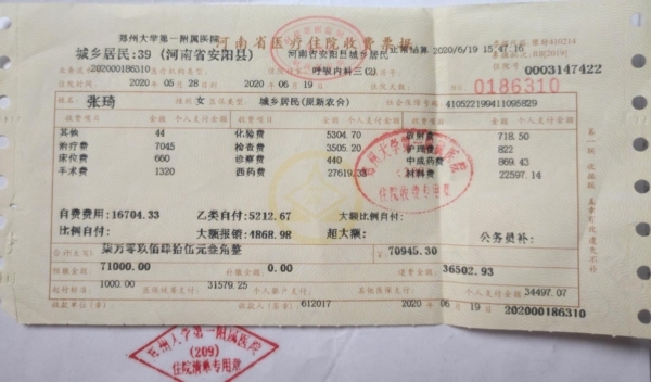 In June 2018, after suffering from a cold for a week, Zhang Qi feared it might be influenza and went to the hospital for examination. They visited the Internal Medicine Department of the First Affiliated Hospital of Zhengzhou University, having heard it was the best hospital. At the time, the doctor told them that while outpatient visits wouldn't be covered by insurance, hospitalization would be reimbursed, and the costs weren't high. It was also a way to help them.