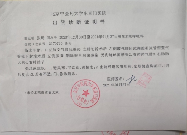 A certificate issued by Dongzhimen Hospital of Beijing University of Chinese Medicine confirms Zhang Qi's lung contains pus and is infected. (Provided by Du Tingxiang and Zhang Qi)