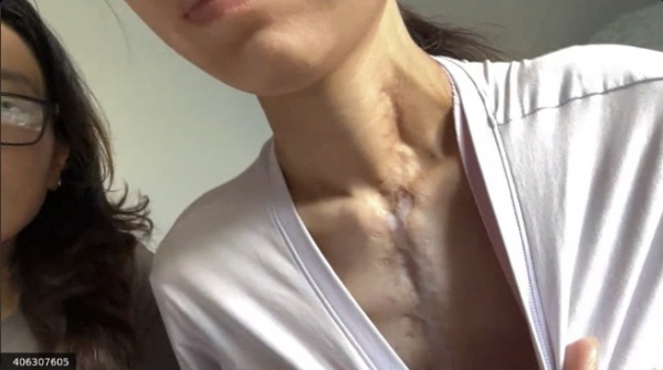 Zhang Qi has undergone over twenty surgeries on her chest to suture her trachea and reconstruct her thoracic cavity. (Video interview screenshot)