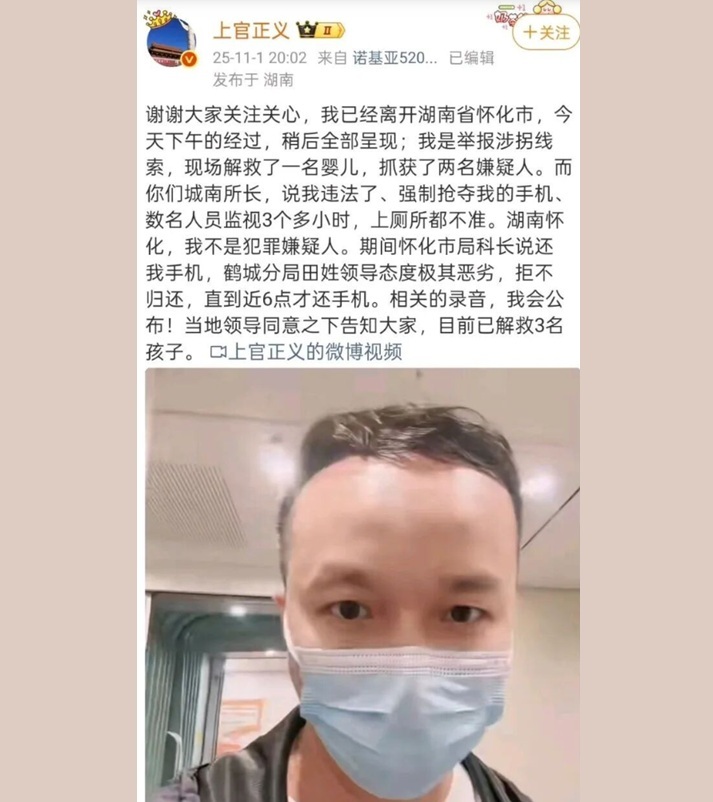 On November 1, a well-known anti-trafficking activist from Sichuan named Shangguan Zhengyi—who independently investigates surrogacy and child trafficking networks—was detained by police in Huaihua, Hunan Province, after reporting an active baby-selling case.