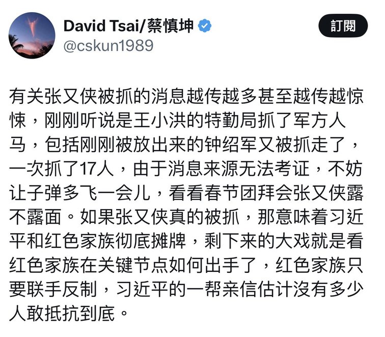 Following this, Cai Shenkun posted again, indicating that he had received alarming news regarding Zhang Youxia's arrest, and the reports were becoming increasingly disturbing.