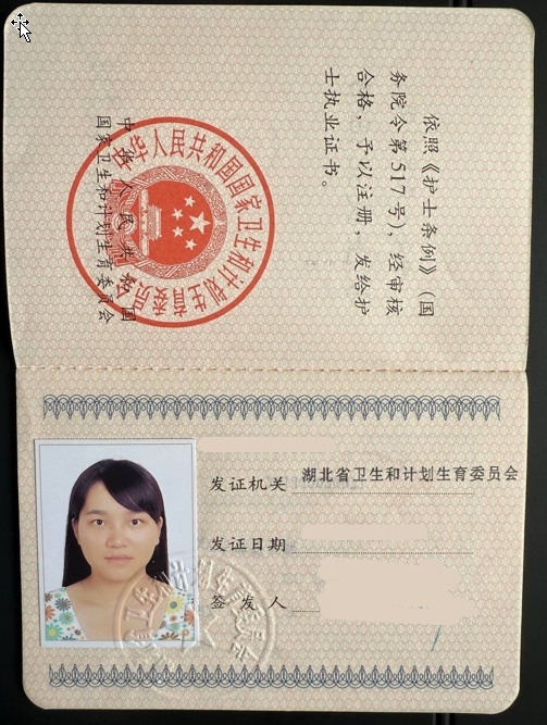 Zhang Yu's nursing license from her time at a Grade A tertiary hospital in Wuhan. (Provided by interviewee)