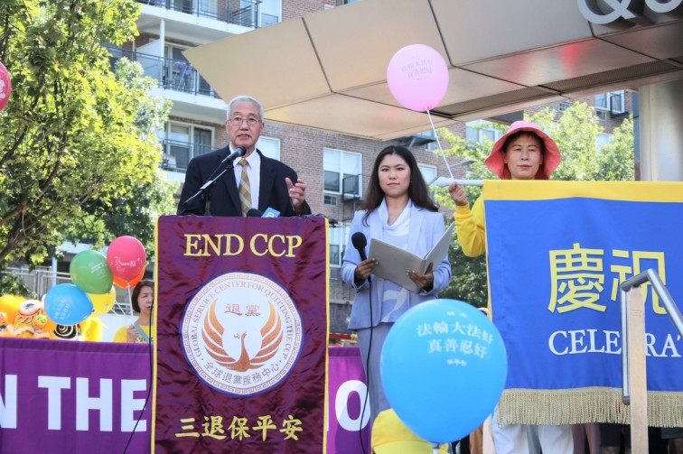On August 10, 2025, Wang Zhiyuan spoke at a rally in Flushing, New York, celebrating the Three Withdrawals surpassing 450 million. (Huang Xiaotang/The Dajiyuan)