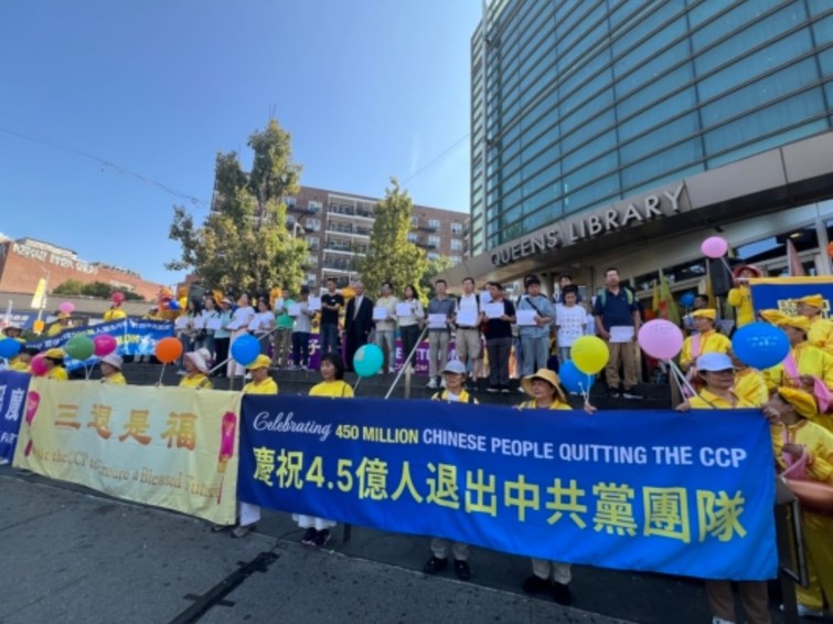 On August 10, 2025, in front of the Flushing Chinatown Library in New York, the Global Service Center for Quitting the CCP held an event celebrating 450 million Chinese people successfully completing the “Three Withdrawals” (withdrawing from the Party, the Youth League, and the Young Pioneers). Twenty-five people publicly announced their withdrawal from the CCP on site and received withdrawal certificates. (Lin Dan / The Dajiyuan)